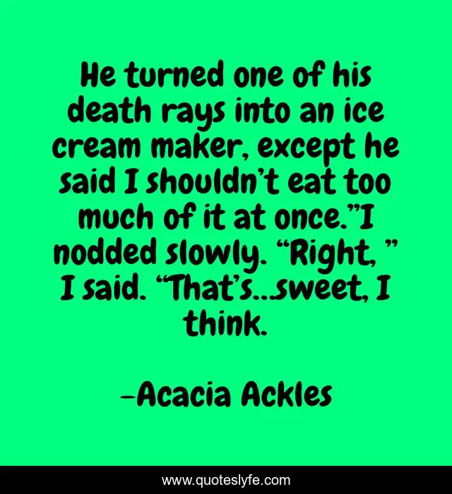 This page presents the quote "He turned one of his death rays into an ice cream maker, except he said I shouldn’t eat too much of it at once.”I nodded slowly. “Right, ” I said. “That’s…sweet, I think.". Author of this quote is Acacia Ackles. This quote is about odd-childhood, heroes, villains, scott, strange-parents,.