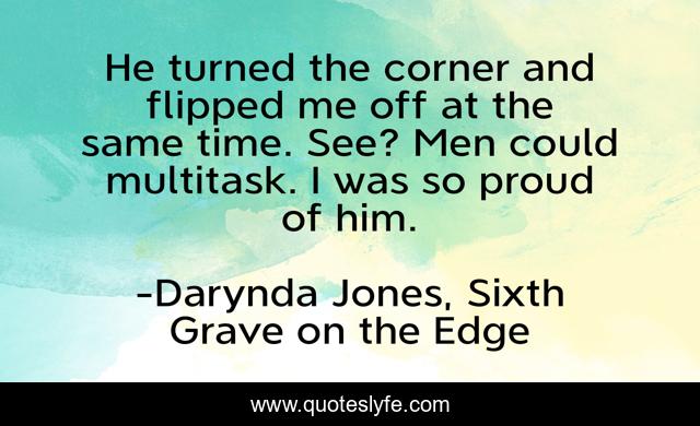 This page presents the quote "He turned the corner and flipped me off at the same time. See? Men could multitask. I was so proud of him.". Author of this quote is Darynda Jones, Sixth Grave on the Edge. This quote is about men, multitask,.