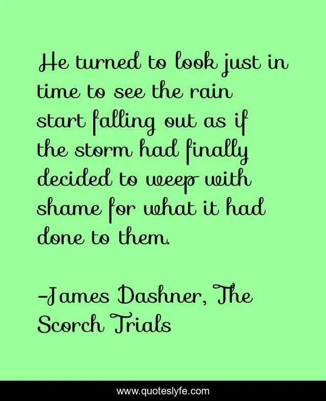 This page presents the quote "He turned to look just in time to see the rain start falling out as if the storm had finally decided to weep with shame for what it had done to them.". Author of this quote is James Dashner, The Scorch Trials. This quote is about rain, storm,.