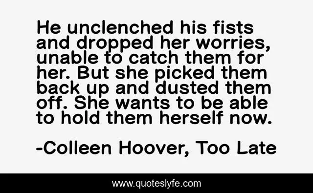This page presents the quote "He unclenched his fists and dropped her worries, unable to catch them for her. But she picked them back up and dusted them off. She wants to be able to hold them herself now.". Author of this quote is Colleen Hoover, Too Late. This quote is about love, tragedy, affection,.