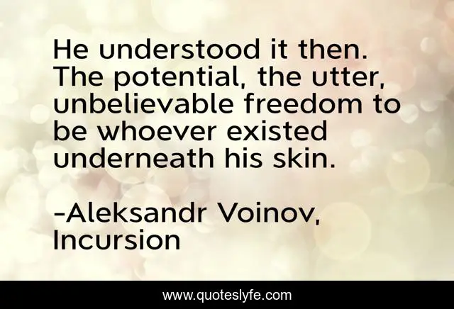 This page presents the quote "He understood it then. The potential, the utter, unbelievable freedom to be whoever existed underneath his skin.". Author of this quote is Aleksandr Voinov, Incursion. This quote is about incursion, self-awareness, healing,.