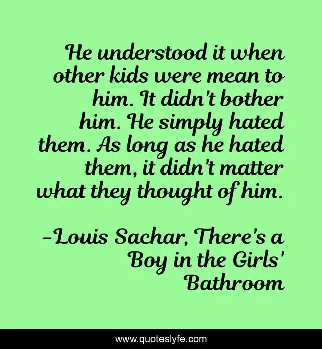 This page presents the quote "He understood it when other kids were mean to him. It didn't bother him. He simply hated them. As long as he hated them, it didn't matter what they thought of him.". Author of this quote is Louis Sachar, There's a Boy in the Girls' Bathroom. This quote is about bullying, friends, kids, hate,.