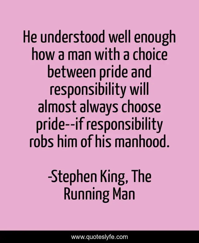 This page presents the quote "He understood well enough how a man with a choice between pride and responsibility will almost always choose pride--if responsibility robs him of his manhood.". Author of this quote is Stephen King, The Running Man. This quote is about king, running, responsibility, stephen, manhood, pride, man,.
