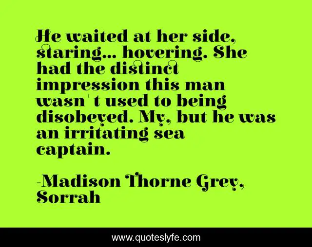 This page presents the quote "He waited at her side, staring... hovering. She had the distinct impression this man wasn't used to being disobeyed. My, but he was an irritating sea captain.". Author of this quote is Madison Thorne Grey, Sorrah. This quote is about sorrah, fantasy-romance-book, paranormal-romance, paranormal-romance-series,.