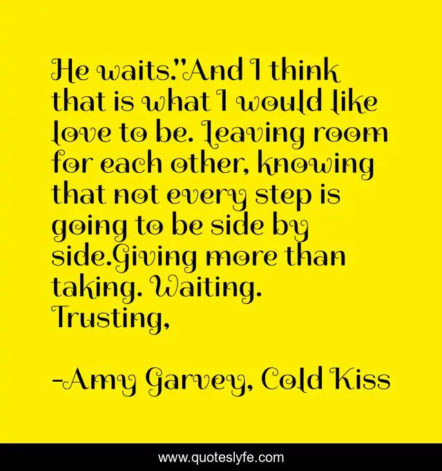 This page presents the quote "He waits."And I think that is what I would like love to be. Leaving room for each other, knowing that not every step is going to be side by side.Giving more than taking. Waiting. Trusting, ". Author of this quote is Amy Garvey, Cold Kiss. .