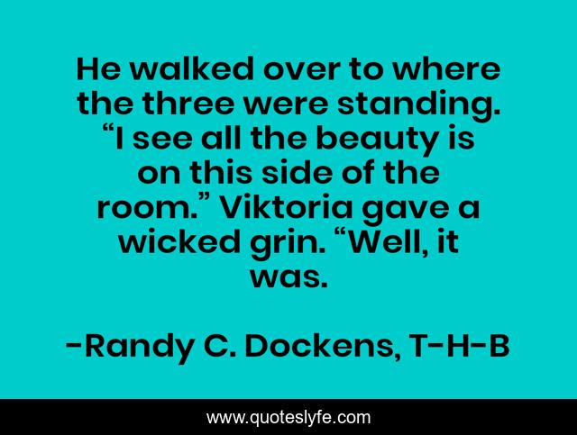 This page presents the quote "He walked over to where the three were standing. “I see all the beauty is on this side of the room.” Viktoria gave a wicked grin. “Well, it was.". Author of this quote is Randy C. Dockens, T-H-B. .