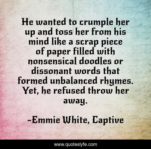 This page presents the quote "He wanted to crumple her up and toss her from his mind like a scrap piece of paper filled with nonsensical doodles or dissonant words that formed unbalanced rhymes. Yet, he refused throw her away.". Author of this quote is Emmie White, Captive. This quote is about sorrow, love, separation, affection,.