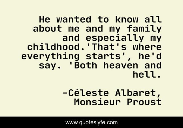 This page presents the quote "He wanted to know all about me and my family and especially my childhood.'That's where everything starts', he'd say. 'Both heaven and hell.". Author of this quote is Céleste Albaret, Monsieur Proust. This quote is about memories, family, proust,.