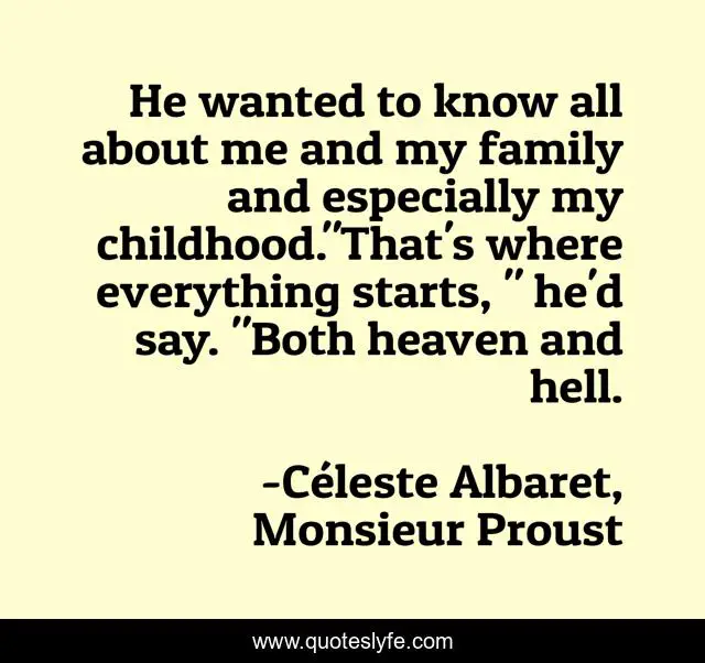 This page presents the quote "He wanted to know all about me and my family and especially my childhood."That's where everything starts, " he'd say. "Both heaven and hell.". Author of this quote is Céleste Albaret, Monsieur Proust. This quote is about memories, family, proust,.