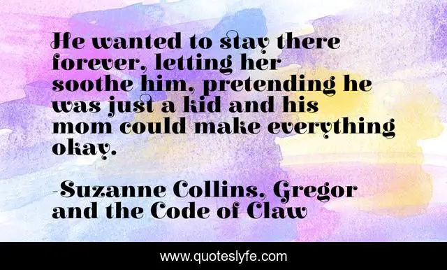 This page presents the quote "He wanted to stay there forever, letting her soothe him, pretending he was just a kid and his mom could make everything okay.". Author of this quote is Suzanne Collins, Gregor and the Code of Claw. This quote is about motherly-love, mothers-love, mom, mother,.