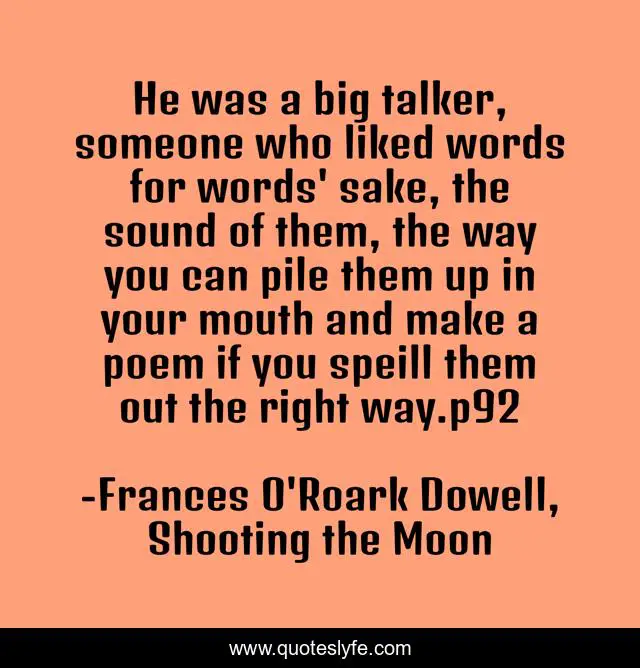 This page presents the quote "He was a big talker, someone who liked words for words' sake, the sound of them, the way you can pile them up in your mouth and make a poem if you speill them out the right way.p92". Author of this quote is Frances O'Roark Dowell, Shooting the Moon. .