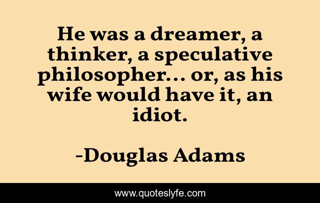 This page presents the quote "He was a dreamer, a thinker, a speculative philosopher... or, as his wife would have it, an idiot.". Author of this quote is Douglas Adams. This quote is about idiot, wife, dreamer,.