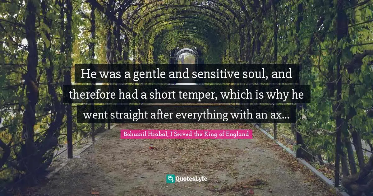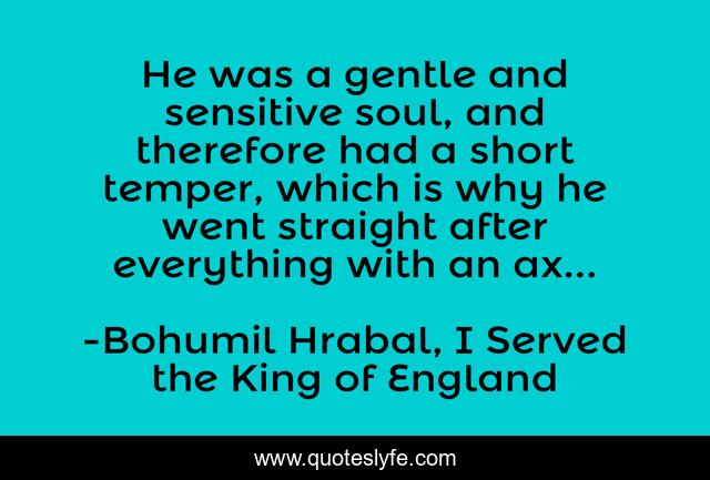 This page presents the quote "He was a gentle and sensitive soul, and therefore had a short temper, which is why he went straight after everything with an ax...". Author of this quote is Bohumil Hrabal, I Served the King of England. This quote is about lovers, love, soul, sensitive, unrequited-love, ax, humor, affection,.