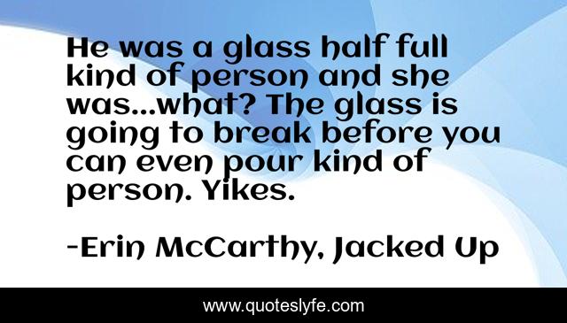 This page presents the quote "He was a glass half full kind of person and she was...what? The glass is going to break before you can even pour kind of person. Yikes.". Author of this quote is Erin McCarthy, Jacked Up. This quote is about life-philosophy, humor,.