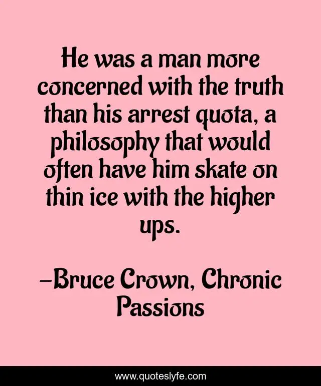 This page presents the quote "He was a man more concerned with the truth than his arrest quota, a philosophy that would often have him skate on thin ice with the higher ups.". Author of this quote is Bruce Crown, Chronic Passions. This quote is about arrest, police, honesty,.