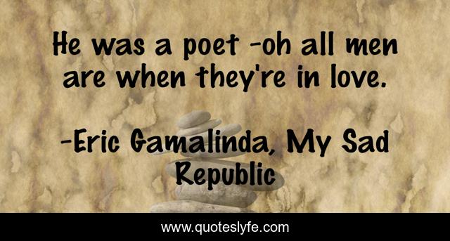 This page presents the quote "He was a poet -oh all men are when they're in love.". Author of this quote is Eric Gamalinda, My Sad Republic. This quote is about poet, men, love, affection,.