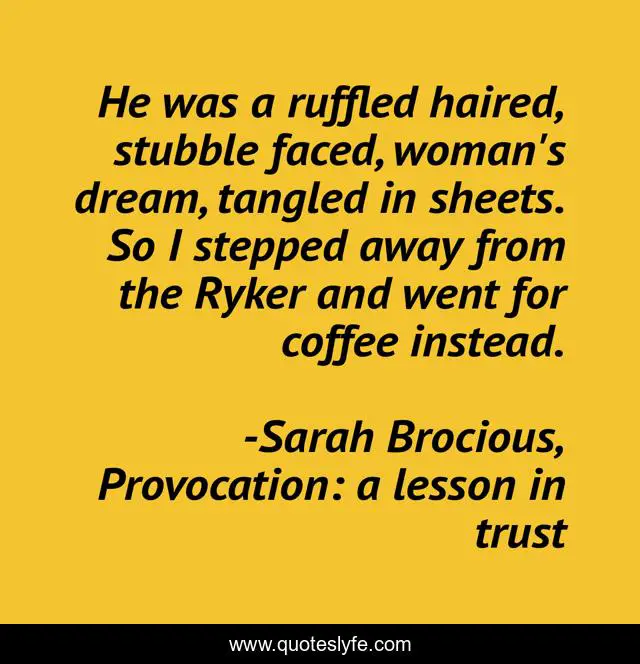 This page presents the quote "He was a ruffled haired, stubble faced, woman's dream, tangled in sheets. So I stepped away from the Ryker and went for coffee instead.". Author of this quote is Sarah Brocious, Provocation: a lesson in trust. This quote is about stubble, love, contemporary-romance, sweet, romance, affection,.