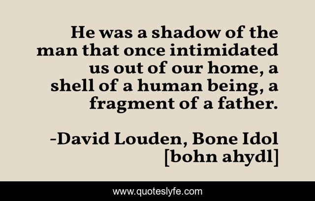 This page presents the quote "He was a shadow of the man that once intimidated us out of our home, a shell of a human being, a fragment of a father.". Author of this quote is David Louden, Bone Idol [bohn ahydl]. This quote is about irish-writer, coming-of-age, literary-fiction, roman-á-clef,.