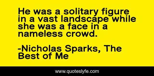 This page presents the quote "He was a solitary figure in a vast landscape while she was a face in a nameless crowd.". Author of this quote is Nicholas Sparks, The Best of Me. This quote is about life, love, affection, reality,.