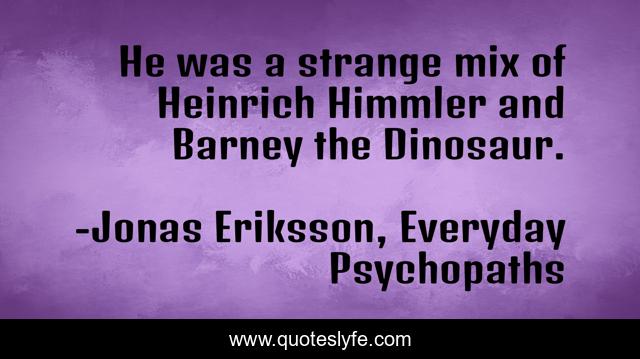 This page presents the quote "He was a strange mix of Heinrich Himmler and Barney the Dinosaur.". Author of this quote is Jonas Eriksson, Everyday Psychopaths. This quote is about dark-humor, horror, humor,.