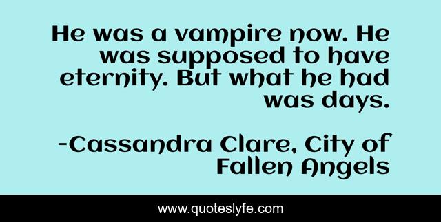 This page presents the quote "He was a vampire now. He was supposed to have eternity. But what he had was days.". Author of this quote is Cassandra Clare, City of Fallen Angels. This quote is about clary, city-of-fallen-angels, simon, decsion, vampires,.