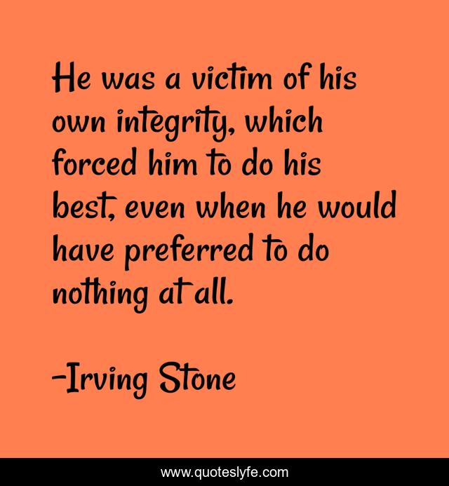 This page presents the quote "He was a victim of his own integrity, which forced him to do his best, even when he would have preferred to do nothing at all.". Author of this quote is Irving Stone. This quote is about self-awareness, self, self-belief, self-improvement, self-motivation, integrity,.