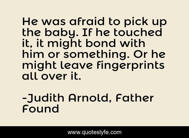 This page presents the quote "He was afraid to pick up the baby. If he touched it, it might bond with him or something. Or he might leave fingerprints all over it.". Author of this quote is Judith Arnold, Father Found. This quote is about parenting, humor,.