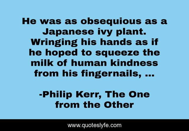 This page presents the quote "He was as obsequious as a Japanese ivy plant. Wringing his hands as if he hoped to squeeze the milk of human kindness from his fingernails, ...". Author of this quote is Philip Kerr, The One from the Other. .
