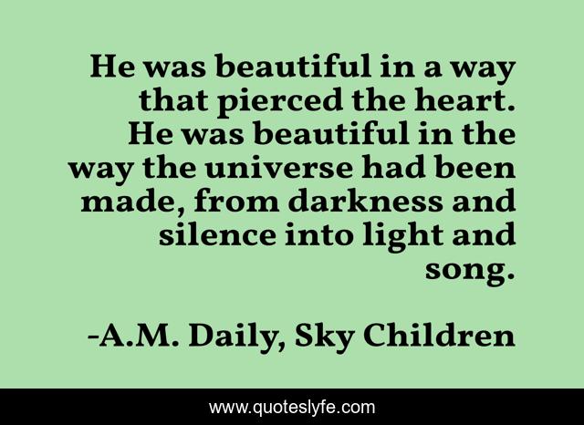 This page presents the quote "He was beautiful in a way that pierced the heart. He was beautiful in the way the universe had been made, from darkness and silence into light and song.". Author of this quote is A.M. Daily, Sky Children. This quote is about romance, beauty,.