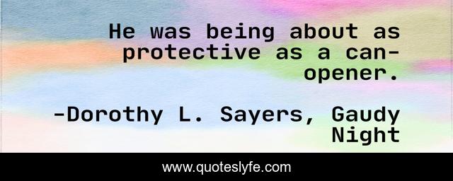 This page presents the quote "He was being about as protective as a can-opener.". Author of this quote is Dorothy L. Sayers, Gaudy Night. This quote is about protectiveness, men,.