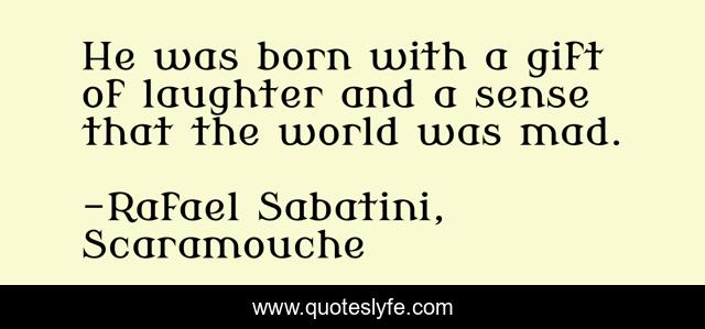 This page presents the quote "He was born with a gift of laughter and a sense that the world was mad.". Author of this quote is Rafael Sabatini, Scaramouche. This quote is about merriment, first-sentence, great-first-lines, opening-lines, literary, laughter, epitaph,.