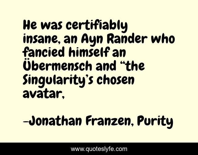 "Jonathan Franzen, Purity Quotes." Quoteslyfe.com, 2025. Sat. 06 Dec. 2025. <https://www.quoteslyfe.com/quote/He-was-certifiably-insane-an-Ayn-Rander-243486>.
