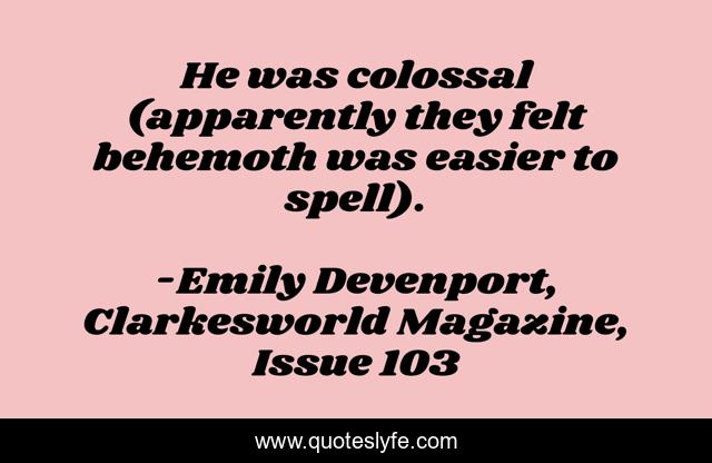 This page presents the quote "He was colossal (apparently they felt behemoth was easier to spell).". Author of this quote is Emily Devenport, Clarkesworld Magazine, Issue 103. This quote is about colossal, monsters, behemoth,.