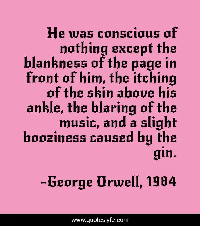 This page presents the quote "He was conscious of nothing except the blankness of the page in front of him, the itching of the skin above his ankle, the blaring of the music, and a slight booziness caused by the gin.". Author of this quote is George Orwell, 1984. .