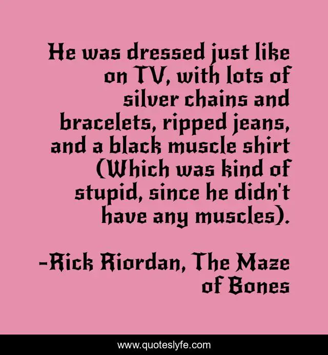 This page presents the quote "He was dressed just like on TV, with lots of silver chains and bracelets, ripped jeans, and a black muscle shirt (Which was kind of stupid, since he didn't have any muscles).". Author of this quote is Rick Riordan, The Maze of Bones. This quote is about muscle-shirt, stupid, humor,.