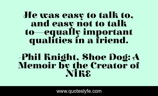 This page presents the quote "He was easy to talk to, and easy not to talk to—equally important qualities in a friend.". Author of this quote is Phil Knight, Shoe Dog: A Memoir by the Creator of NIKE. This quote is about friends, friendship,.