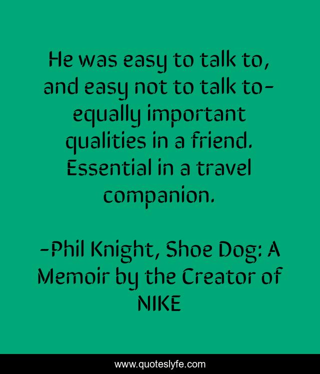 This page presents the quote "He was easy to talk to, and easy not to talk to-equally important qualities in a friend. Essential in a travel companion.". Author of this quote is Phil Knight, Shoe Dog: A Memoir by the Creator of NIKE. .