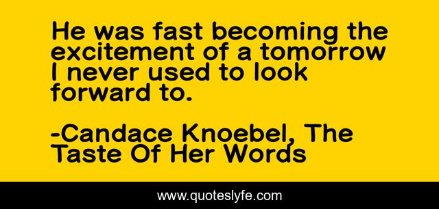 This page presents the quote "He was fast becoming the excitement of a tomorrow I never used to look forward to.". Author of this quote is Candace Knoebel, The Taste Of Her Words. This quote is about romance-book, love, hope-for-each-day, hopeful, forbidden-love, affection,.