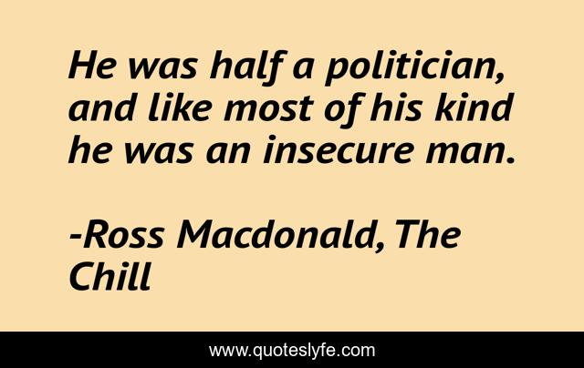 This page presents the quote "He was half a politician, and like most of his kind he was an insecure man.". Author of this quote is Ross Macdonald, The Chill. .