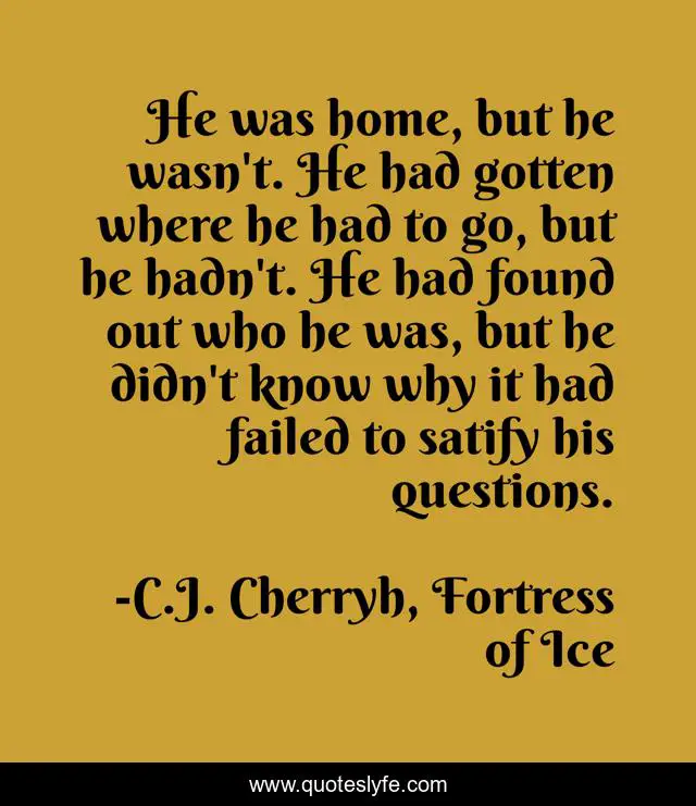 This page presents the quote "He was home, but he wasn't. He had gotten where he had to go, but he hadn't. He had found out who he was, but he didn't know why it had failed to satify his questions.". Author of this quote is C.J. Cherryh, Fortress of Ice. .