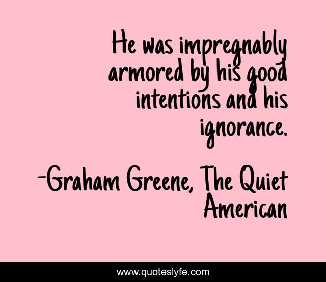 This page presents the quote "He was impregnably armored by his good intentions and his ignorance.". Author of this quote is Graham Greene, The Quiet American. .
