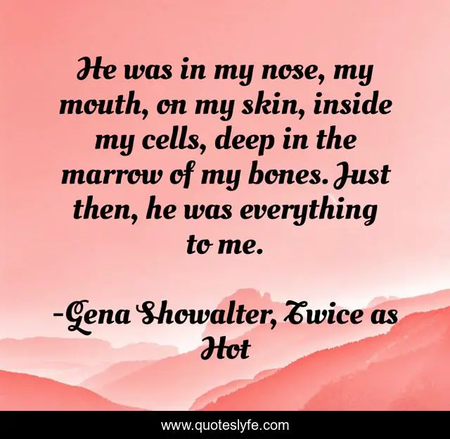 This page presents the quote "He was in my nose, my mouth, on my skin, inside my cells, deep in the marrow of my bones. Just then, he was everything to me.". Author of this quote is Gena Showalter, Twice as Hot. .