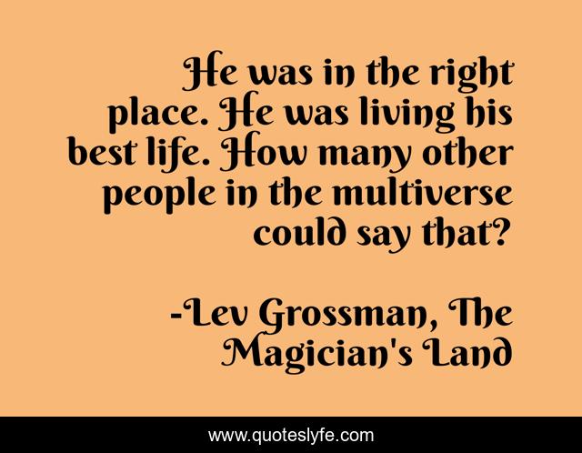 This page presents the quote "He was in the right place. He was living his best life. How many other people in the multiverse could say that?". Author of this quote is Lev Grossman, The Magician's Land. This quote is about living, life, multiverse, right-place,.