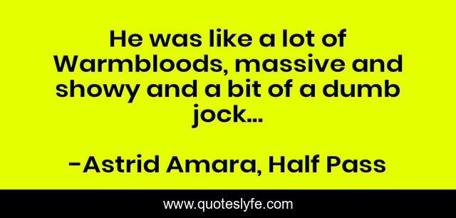 This page presents the quote "He was like a lot of Warmbloods, massive and showy and a bit of a dumb jock...". Author of this quote is Astrid Amara, Half Pass. This quote is about horses, m-m, glbt-romance, romance,.
