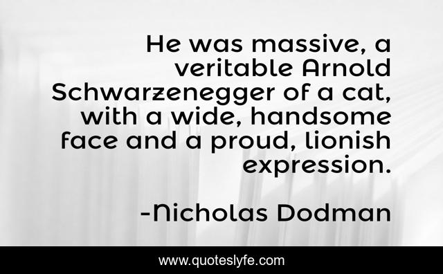 This page presents the quote "He was massive, a veritable Arnold Schwarzenegger of a cat, with a wide, handsome face and a proud, lionish expression.". Author of this quote is Nicholas Dodman. This quote is about enthusiasm, cats, inspirational,.