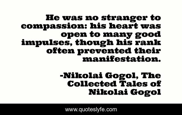 This page presents the quote "He was no stranger to compassion: his heart was open to many good impulses, though his rank often prevented their manifestation.". Author of this quote is Nikolai Gogol, The Collected Tales of Nikolai Gogol. This quote is about compassion, hierarchy, social-commentary, satire,.