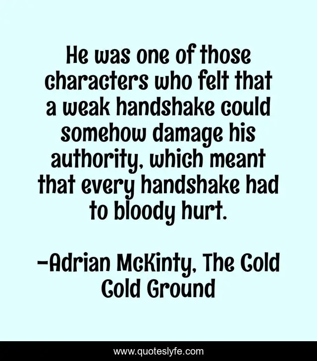 This page presents the quote "He was one of those characters who felt that a weak handshake could somehow damage his authority, which meant that every handshake had to bloody hurt.". Author of this quote is Adrian McKinty, The Cold Cold Ground. This quote is about handshake, authority,.