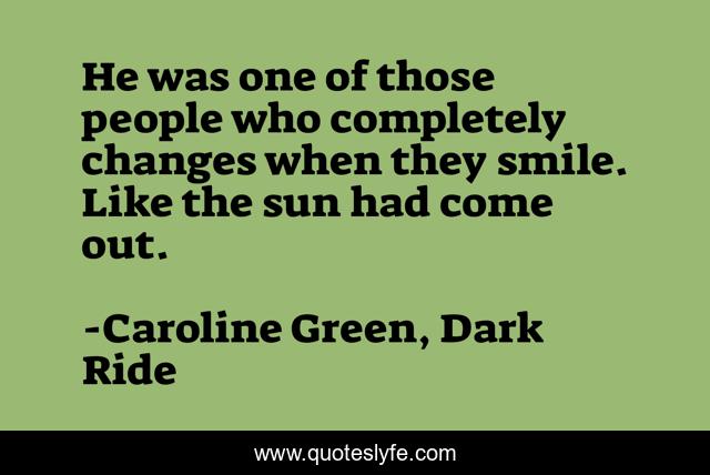 This page presents the quote "He was one of those people who completely changes when they smile. Like the sun had come out.". Author of this quote is Caroline Green, Dark Ride. This quote is about change, smile, one-of-those-people, happiness, sun-coming-out,.