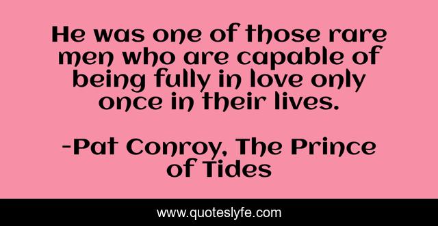 This page presents the quote "He was one of those rare men who are capable of being fully in love only once in their lives.". Author of this quote is Pat Conroy, The Prince of Tides. This quote is about men, love, affection,.