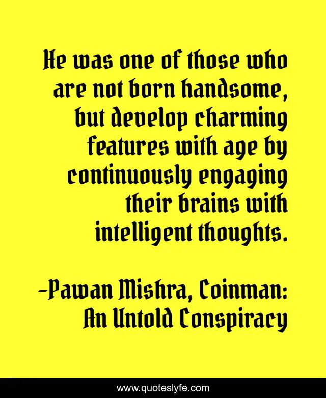 This page presents the quote "He was one of those who are not born handsome, but develop charming features with age by continuously engaging their brains with intelligent thoughts.". Author of this quote is Pawan Mishra, Coinman: An Untold Conspiracy. This quote is about features, age, charming, brain, intelligent, personality,.